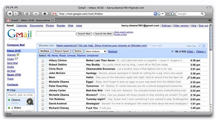 Posted on September 19, 2008 by lizbethObama’s Gmail Account Oh Onion, you crack me up. via Share this: Click to share on Facebook (Opens in new window) Facebook Click to share on X (Opens in new window) X Like Loading... Related