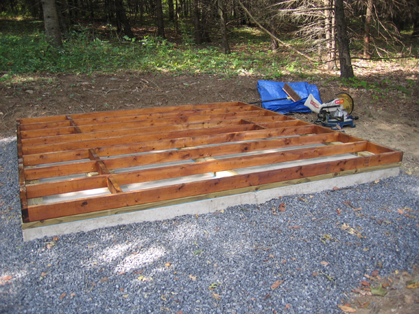 This weekend was very productive. We finished the sill plate and floor frame for our ReadyMade shed! Yeah! This is really coming together. So far in order to stay on the property we have had to camp. I think I mentioned already that I am not much of a camper so I am super fantastically excited that our second building (the outhouse being the first) is coming along so well. This 10×10 room will have a futon, a small fridge and a bit of storage so that we don’t have to set up/take down our camping equipment every time we want to get away. We area also hoping that now we won’t have to eat every meal out. We have the plywood for the floor ready to go when we get up there again and we will be buying the lumber for the rest of the frame. We have also started planning what we will put on the exterior.