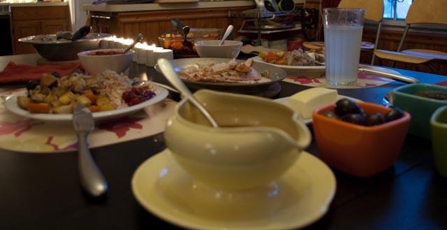 M was responsible for everything potato and I took care of the rest. He is also on clean up duty, just in case you thought he got away easy. I had the brilliant idea of freezing two whole meals so that we aren’t eating leftovers until next week. I am thankful that I didn’t have to camp on the property at all this year thanks to our 10×10 and M is thankful we aren’t pounding the pavement looking for jobs. I hope that your Thanksgiving was at least as good as ours.