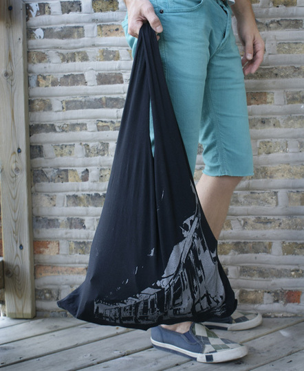 M&I have been taking a long hard look at our stuff and coming quickly to the conclusion that some of it has to go. Many things have been very easy to freecycle, recycle, craigslist, or haul to the thrift store. Other things have been harder to part with. Each of us has quite the collection of t-shirts that we wouldn’t wear in a million years, but have sentimental value. M’s mom is a very talented quilter and has started on a t-shirt quilt using many of M’s shirts. I was considering making a shirt rug, but cutting them into strips is as hard to contemplate as shipping them off. So now what… with this so simple tutorial on Apartment Therapy I can give them a new life as a tote. I am pretty sure even I can handle this sewing project. And who doesn’t need a few more reusable washable bags around the house? This way instead of taking up space in a drawer or bin they can be out and about for me to enjoy.