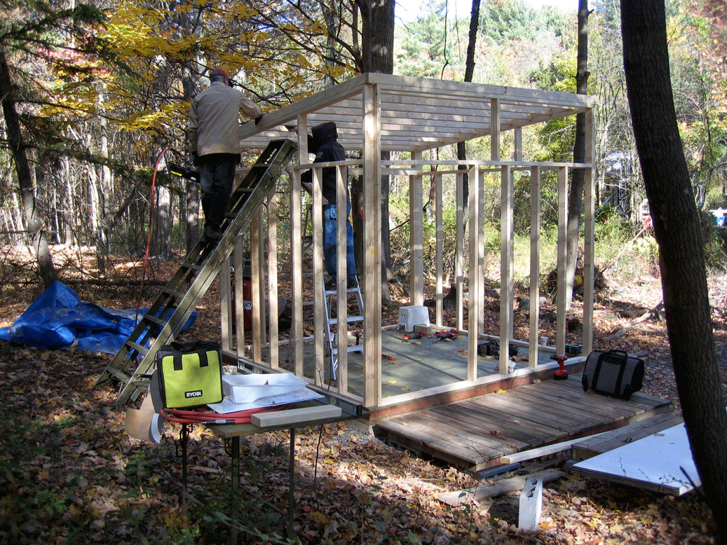 I am a sucker for advertising. I like nicely designed things which appear easy to make. As you may have read on this blog, M&I are attempting to built the ReadyMade MD100 shed. Neither of us has any construction experience whatsoever, but they claim two people can build this in one weekend for the relatively small sum of $1500. A bargain! Maybe this would take one weekend if you had two highly trained, seasoned carpenters. And that is only if they have the site prepared (or are building on a perfectly level site) and have all of the material delivered and pre-cut. I hate to sound bitter here, but as M&I forge ahead with these plans, we are noticing a lot of things that were designed in the name of cheap instead of right. There is nothing 16″ on center, which means when we are interested in putting up paneling instead of the corrogated metal, uh oh, nothing is 4′ wide so we have to put in extra studs. Yikes, we have a significant snow load, the roof they designed may not be enough… sigh. I would like to thank my dad and grandfather again for coming out and helping until late last night. We got A LOT done. The frame is up, the roof has plywood, we even have some of the siding in place. We still have at least a long weekend of work ahead of us to put in the doors (one sliding glass and one steel) and to finish the roof (we still aren’t exactly sure what has to happen there) and finish siding the whole thing. I am not going to say don’t buy the plans if you have your heart set on one of these, but keep in mind, one weekend and $1500 IS too good to be true.