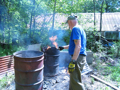 This past weekend M&I were joined by my dad and grandfather upstate to get some work done, and boy did we ever! This is the bench that we put together with the outhouse in the background. You can’t see but my project this weekend was creating a mulch path that leads to the outhouse. Grandpa is going to paint us a sign for it. We also made a rain cover with the largest tarp I have ever seen AND got the floor put together for our ReadyMade shed! Phew! I can’t thank those guys enough. They come up, we laugh we set things on fire, we get things done. It is fantastic. I hope that one day soon they will be able to come up and laugh and set things on fire and relax a little. Maybe next time Grandpa, you can keep the fire inside the burn barrel? (If you look closely at the following picture you will notice a not so little fire to the right of the burn barrels.)
